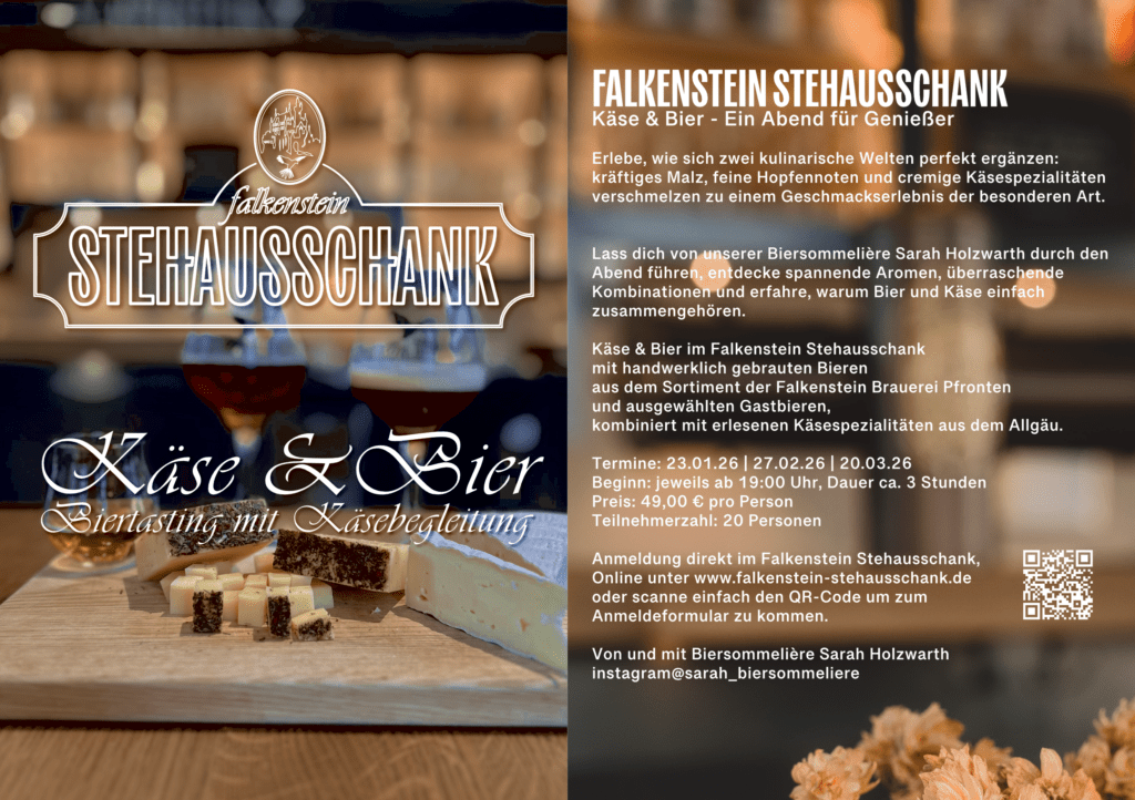 Jedes erste Wochenende im Monat könnt Ihr von Donnerstag bis Samstag auf eine oder mehrere süffige Falkenstein Halbe (natürlich haben wir auch was für Nicht-Bier Trinker*Innen im Angebot) in unserem Stehausschank einkehren. Zum Essen gibt ́s lecker Holzofen-Pizza von nebenan.